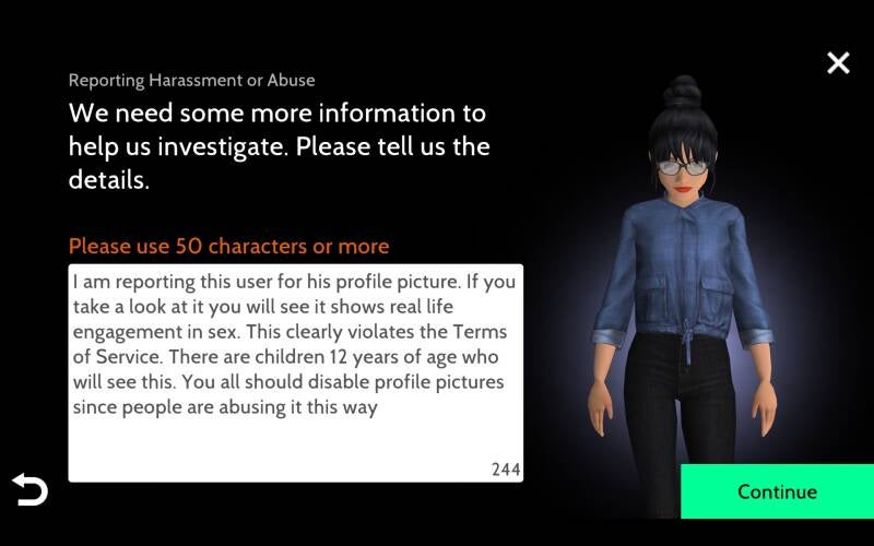 This section contains sexually explicit photos which some users have chose to use as their profile pictures in Avakin Life (which violates the Terms of Service!) If you are not 18 or older, do not continue further! The profiles of the people who are breaking Avakins Terms of Service were put on here to show proof that these users are intentionally breaking Avakin Lifes Terms of Service and that they are exploiting discord and or mods to change their profile pic.