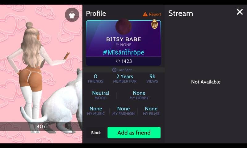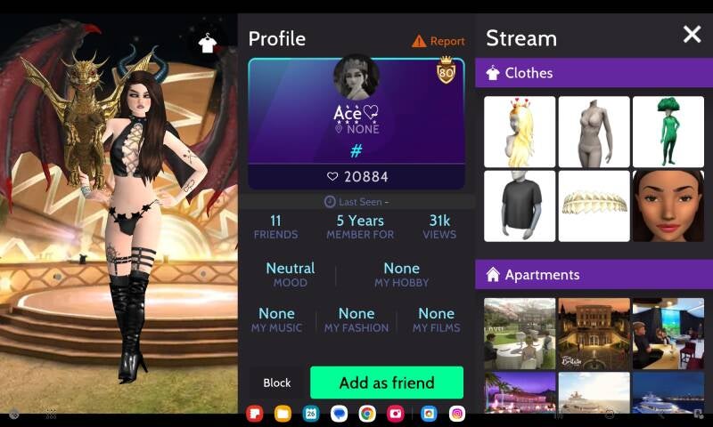 23,800 profile likes on a 2 year account breaks down to 991 profile likes a month every month since the start of the account, even when the player isn't on. This is inconsistant with how real likes work in avakin. Obviously, yet another player buying likes via 3rd party services like discord as well as buying modded items as you can see by the bruise she has on her leg which has not been available longer than the age of her account.