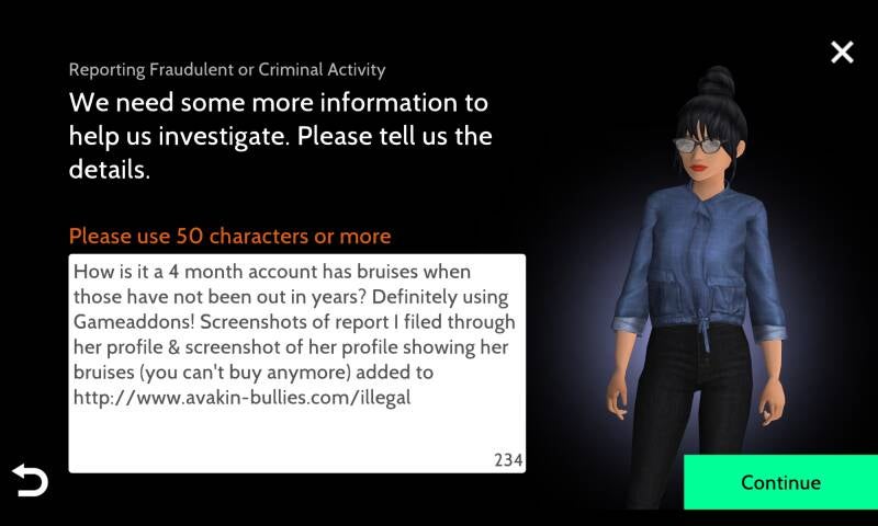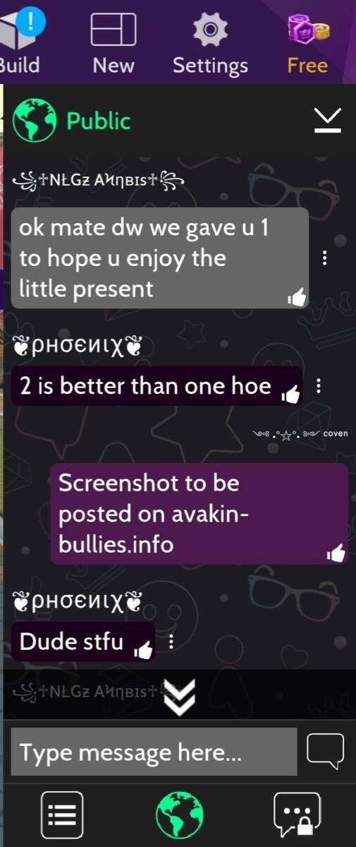 If you have screenshots you wish to submit that you would like listed on this site to warn other players of illegal modders, account names, coin/crown & account sellers in avakin life that you come across, you may send them to: admin@avakin-bullies.info or admin@the-coven.org We ask that you submit screenshots from a private email address so we may respect your privacy. Make sure to include screenshots of the persons profile and conversation.