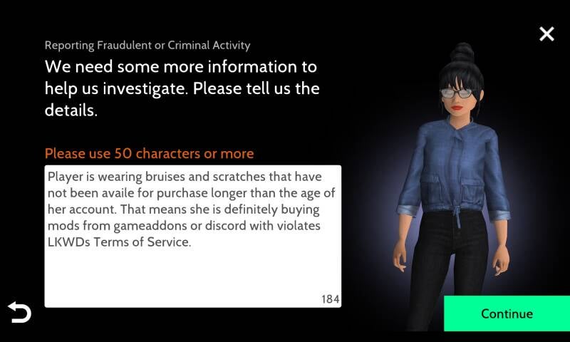Player is wearing bruises & scars that have not been available in the avakin shop longer than the age of her account. This is indicative of them using 3rd party services like discord to buy modded items which violated LKWDs Terms of Service.